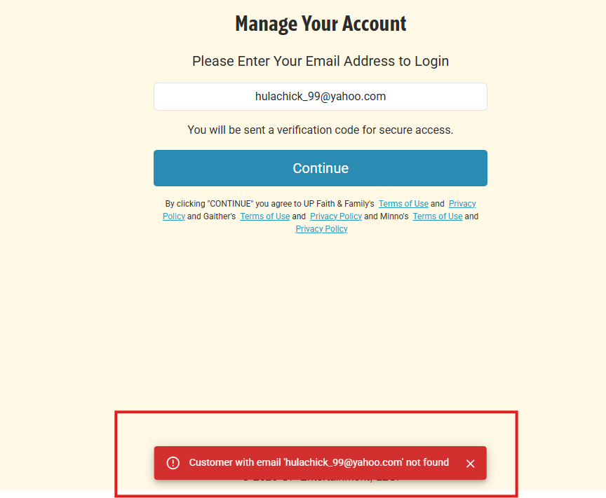 If you receive an error after entering you email address on the main portal page (see below), this indicates that either you signed up using a different email address or you did not sign up directly with UP Faith & Family.