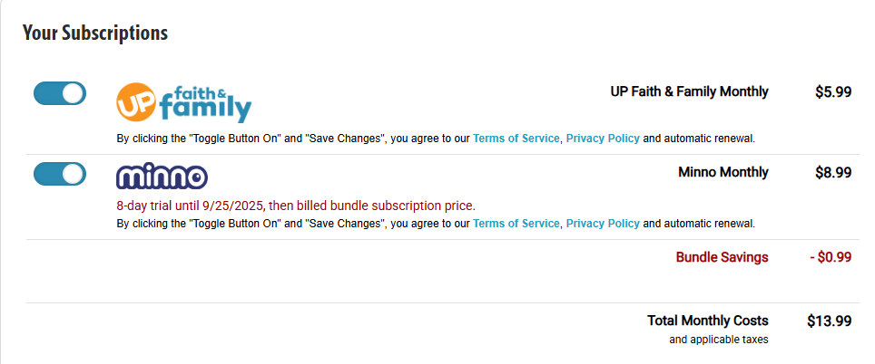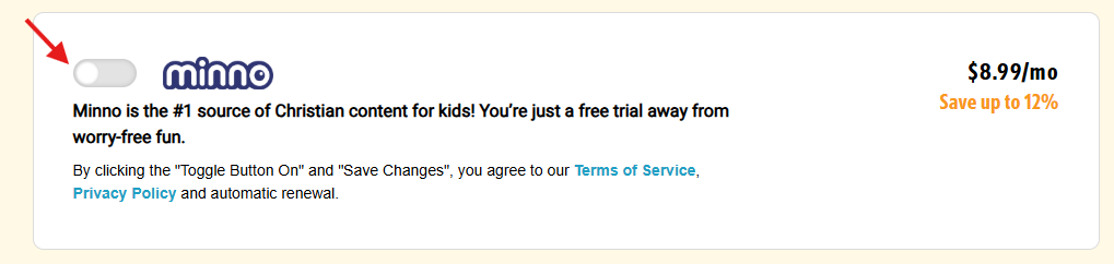 Once you have toggled the subscription on for Minno you will see it appear above next to your other existing subscriptions